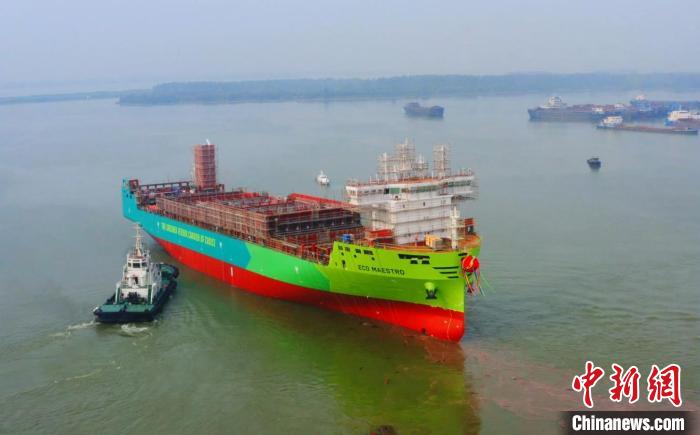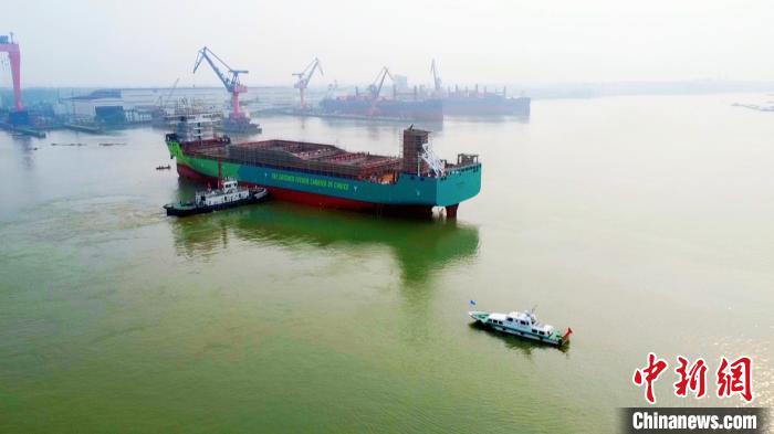 中國首艘小型甲醇雙燃料集裝箱船在揚(yáng)州下水。揚(yáng)州海事局供圖