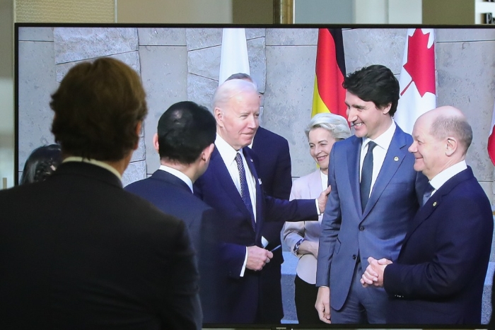 2022年3月24日,在比利時布魯塞爾的北約總部,一名男子觀看屏幕上美國總統(tǒng)拜登(右四)、歐盟委員會主席馮德萊恩(右三)、加拿大總理特魯多(右二)、德國總理朔爾茨(右一)出席七國集團峰會合影儀式的畫面。新華社記者鄭煥松攝