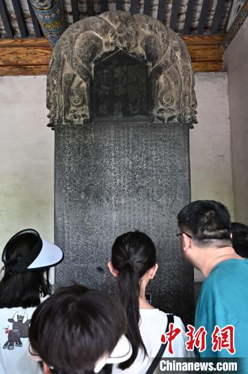 記者在現(xiàn)場看到,晉祠圣母殿前,身著黃袍的“李世民”拿起毛筆,親筆寫下《晉祠銘》,還原上述歷史場景。當(dāng)天,位于晉祠貞觀寶翰亭內(nèi)的《晉祠銘》原碑前,眾多游客久久駐足,細(xì)細(xì)觀賞。其中不乏參加研學(xué)游的青少年。