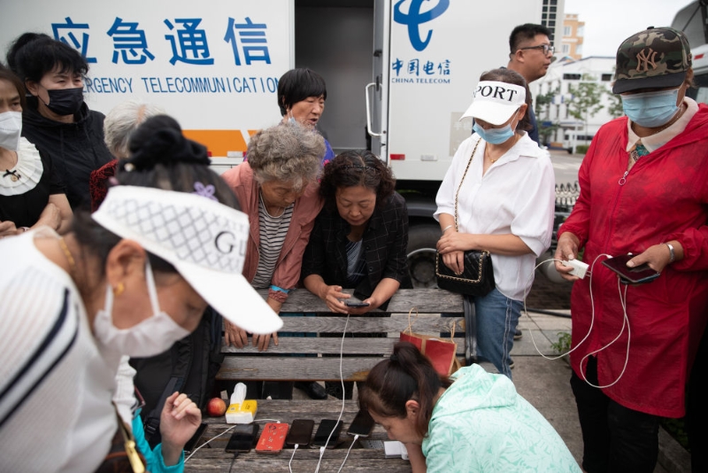 8月6日,人們在黑龍江省海林市長汀鎮(zhèn)一廣場上的應(yīng)急通信車前與外界通話。新華社記者 張濤 攝