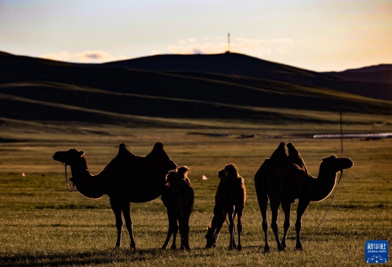 這是8月18日在蒙古國泰吉山谷拍攝的沐浴在夕陽里的駱駝。