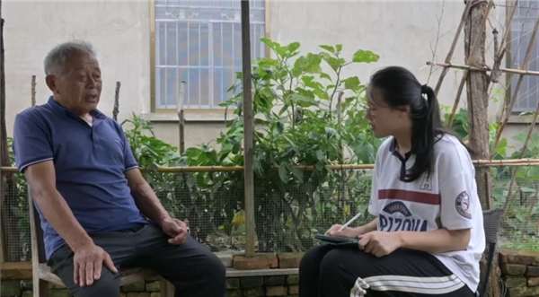 圖為實(shí)踐團(tuán)成員曹安妮對(duì)農(nóng)場(chǎng)工作人員曹應(yīng)章進(jìn)行采訪 周昱彤供圖