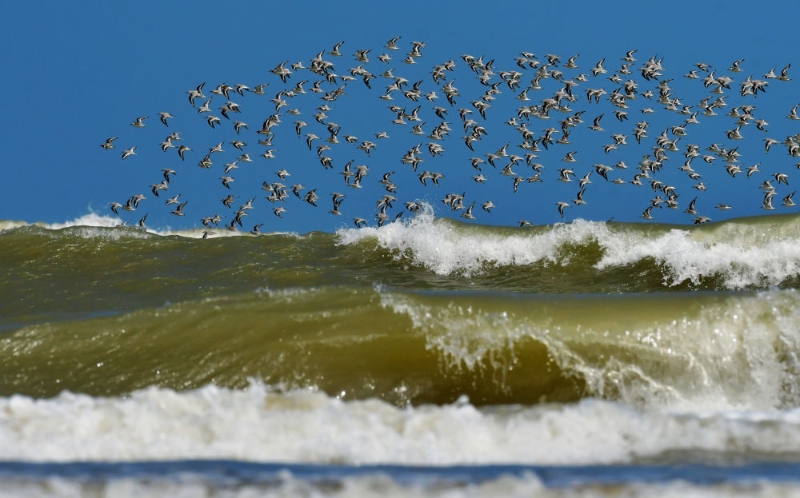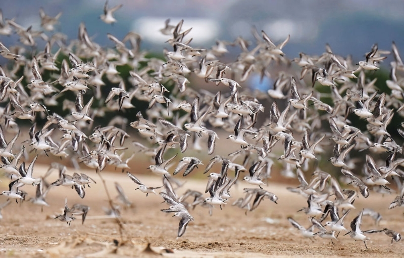 一群鳥飛越閩江河口濕地國家級(jí)自然保護(hù)區(qū)沙灘(2022年11月13日攝)。新華社記者 魏培全 攝