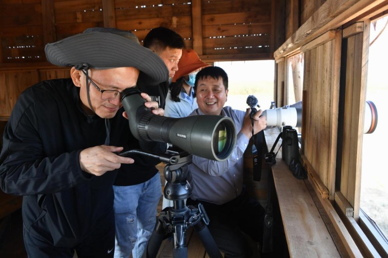 閩江河口濕地國家級(jí)自然保護(hù)區(qū)管理處主任鄭航(右一)和同事在閩江河口濕地核心區(qū)域觀鳥屋里,用望遠(yuǎn)鏡和相機(jī)觀測(cè)記錄停留在濕地里的候鳥種類(2022年11月19日攝)。新華社記者 魏培全 攝
