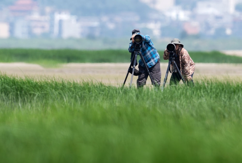 在閩江河口濕地國家級(jí)自然保護(hù)區(qū)核心區(qū),兩名觀鳥愛好者架起相機(jī)拍攝中華鳳頭燕鷗(2023年6月25日攝)。新華社記者 魏培全 攝