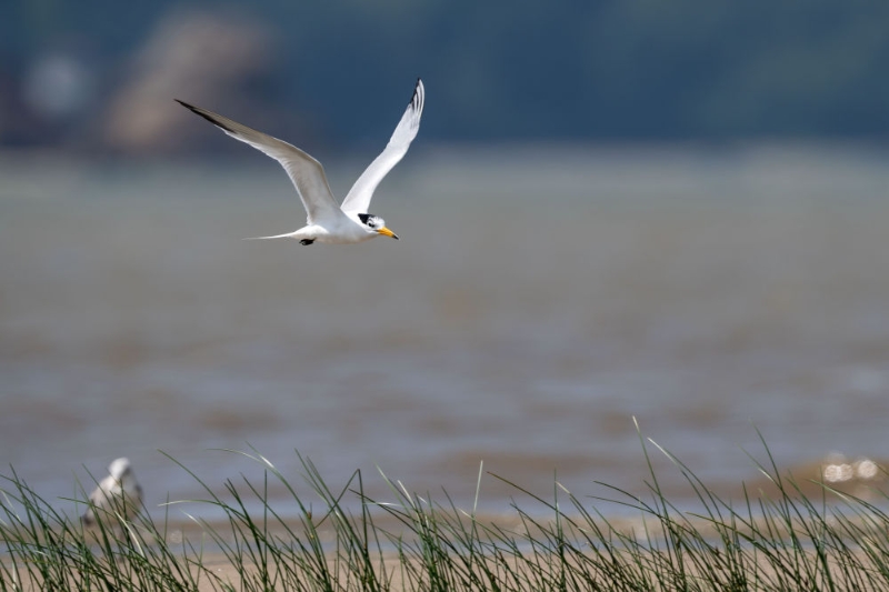 被譽(yù)為“神話之鳥”的中華鳳頭燕鷗掠過閩江河口濕地國家級(jí)自然保護(hù)區(qū)核心區(qū)沙灘(2023年6月25日攝)。新華社記者 魏培全 攝