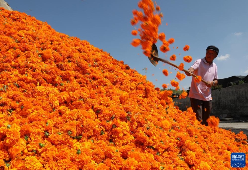 8月20日,在河北省平泉市平北鎮(zhèn)的萬壽菊花朵收儲基地,農(nóng)民將剛剛采收的萬壽菊花朵進(jìn)行集中收儲。