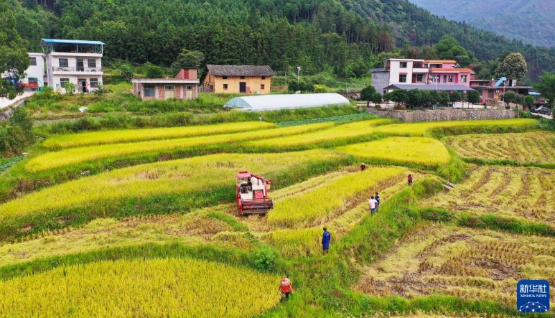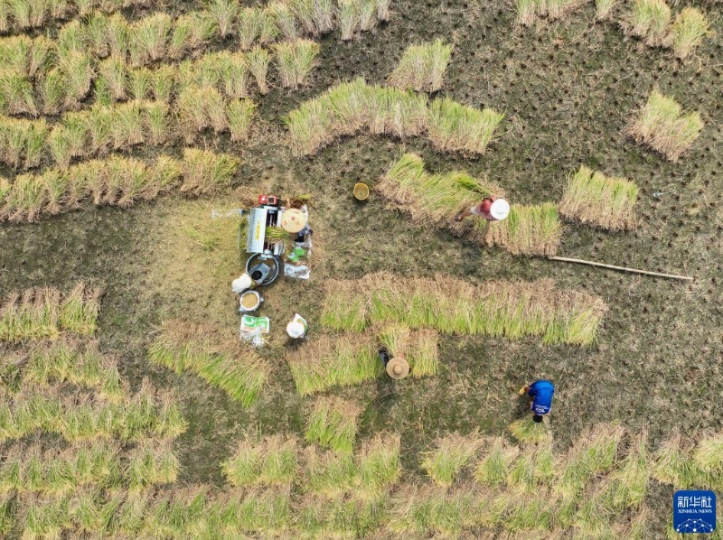 8月20日,在湖南省永州市道縣清塘鎮(zhèn)廖家村,農(nóng)民在收獲水稻(無人機(jī)照片)。