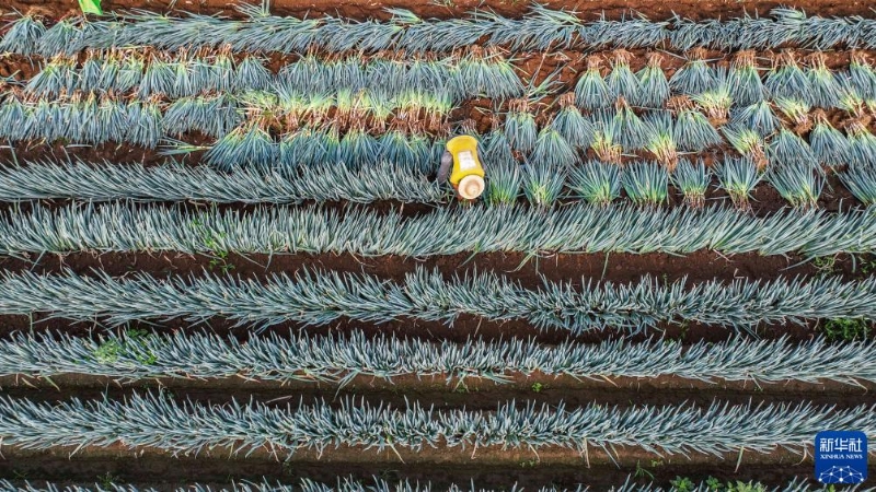 8月20日,農(nóng)民在河北省遵化市一家蔬菜種植合作社的田間收獲大蔥(無人機(jī)照片)。