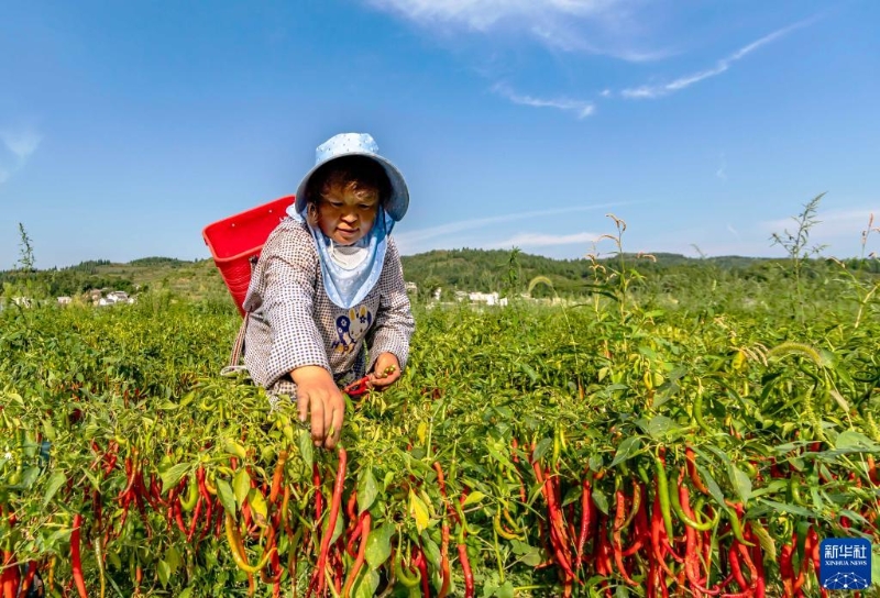 村民在貴州省黔西市林泉鎮(zhèn)營腳村采摘辣椒(8月20日攝)。