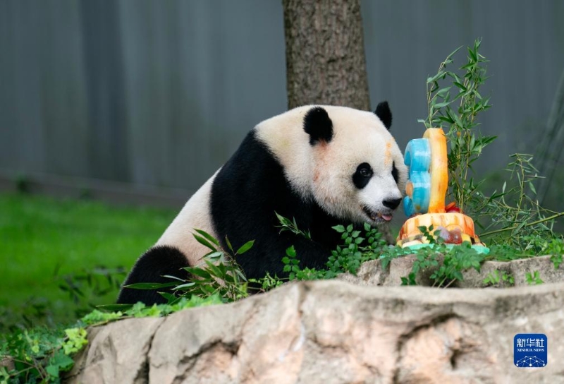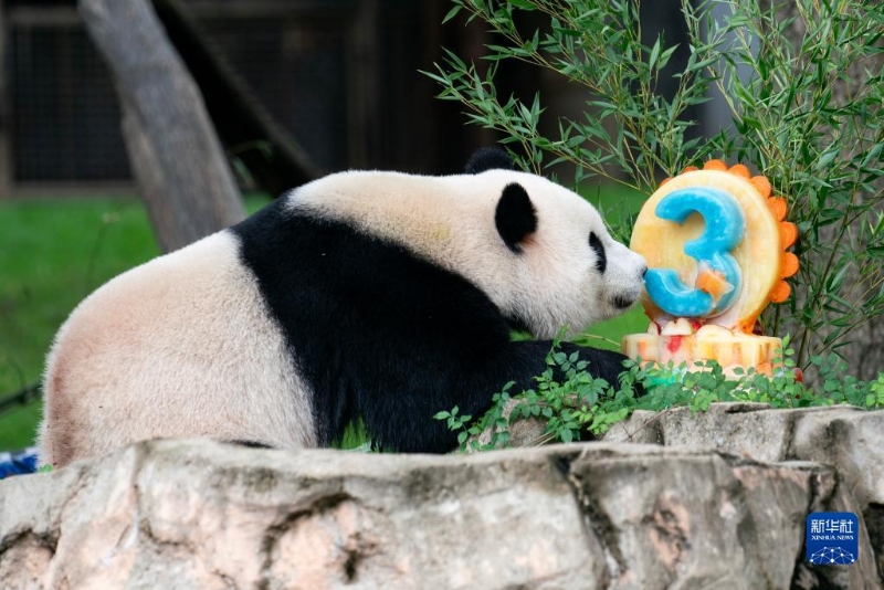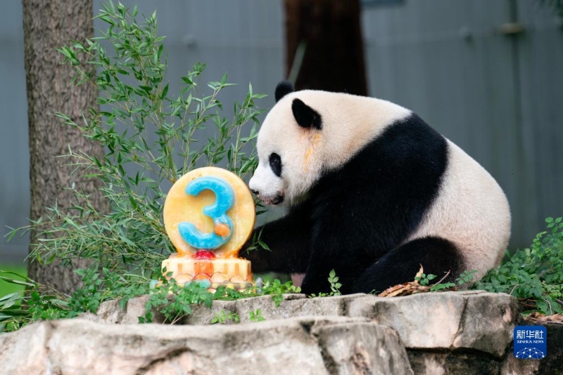 8月21日,大熊貓幼崽“小奇跡”在美國首都華盛頓史密森學(xué)會國家動物園享用生日蛋糕。