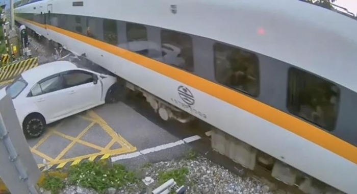 根據(jù)監(jiān)視器畫面,太魯閣號北上行駛,列車已通過平交道約一半的位置,這時白色轎車不知何故突然沖破平交道柵欄,直接撞擊列車車廂下方。撞擊力過大車輛直接翻倒約180度,車頭全毀。