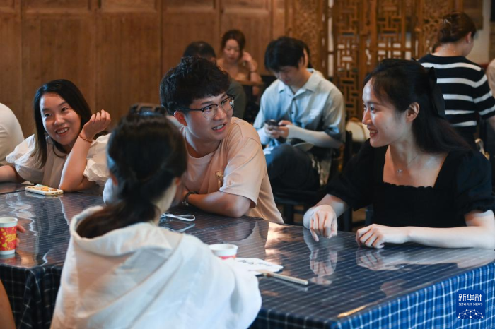 8月20日,青年人才在東白湖鎮(zhèn)裕昌號民間藝術(shù)館參加“十里紅妝”聯(lián)誼活動。新華社記者 徐昱 攝