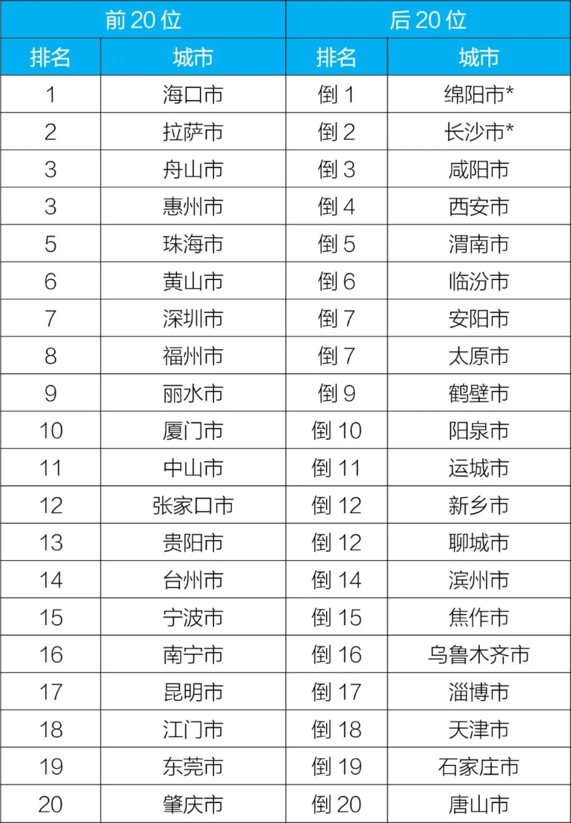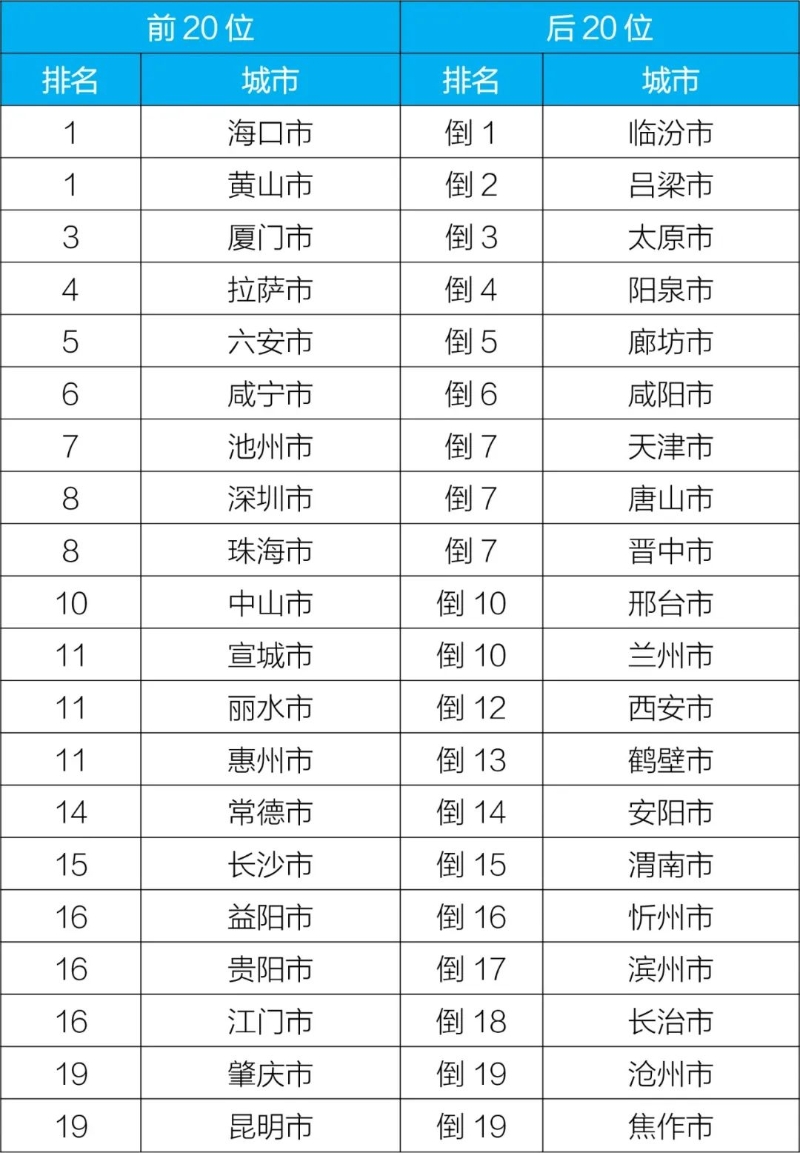 7月,168個重點(diǎn)城市中,空氣質(zhì)量排名前20位城市依次是??凇ⅫS山和廈門等城市(從第1名至并列第19名);空氣質(zhì)量排名后20位城市依次是臨汾、呂梁和太原等城市(從倒數(shù)第1名至并列倒數(shù)第19名)。見附表1。