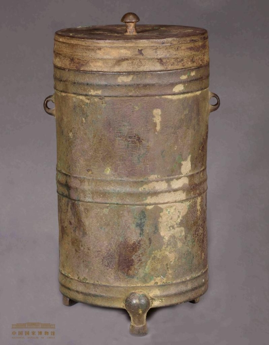 鋞(音同“形”)為出門攜帶使用的盛酒器或盛食器。據(jù)介紹,這一西漢河平元年銅鋞高29.5厘米,直徑12.8厘米,器身外壁有銘文31字,其中“河平元年供工昌造銅鋞”的文字內(nèi)容,是其斷代的重要依據(jù)。該類器物的命名,曾有“提梁卣”“樽”“奩”“奩形器”“三足提梁筒形器”等說法。