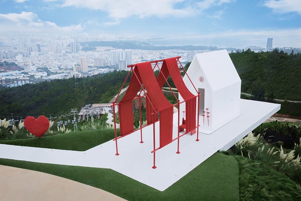 此外,在大理云想山,DR 以腳?架為框架,紅線為飾?,搭建出?座懸崖上的半露天紅?禮堂,毗鄰花海,眺望洱海,成了觀賞日落夜景的打卡圣地,堪稱阿那亞禮堂“貴替”。