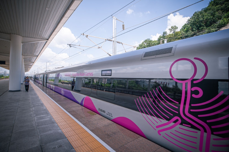 這是亞運(yùn)智能動(dòng)車組??吭诘虑逭菊九_(tái)(2023年8月4日攝)。新華社記者 江漢 攝