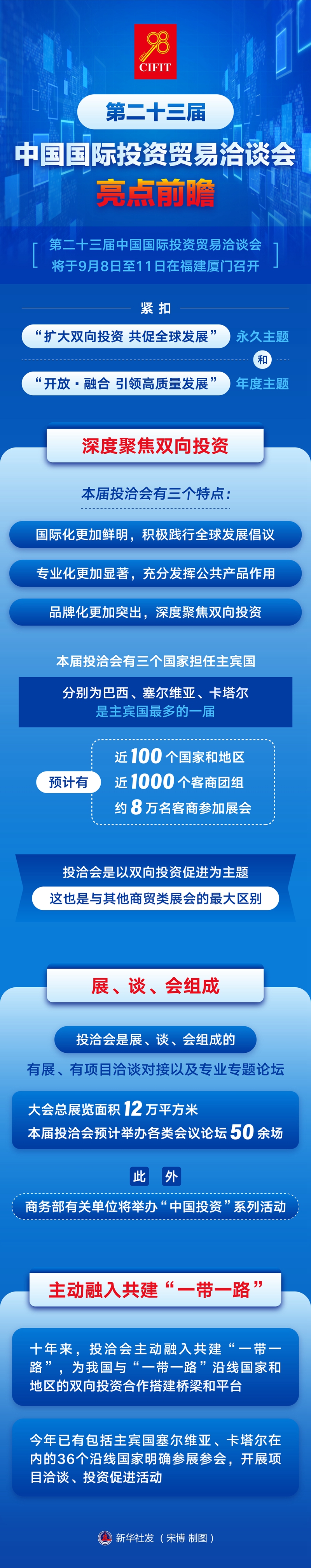 第二十三屆中國(guó)國(guó)際投資貿(mào)易洽談會(huì)將于9月8日至11日在福建廈門(mén)召開(kāi),緊扣“擴(kuò)大雙向投資 共促全球發(fā)展”永久主題和“開(kāi)放·融合 引領(lǐng)高質(zhì)量發(fā)展”年度主題。國(guó)務(wù)院新聞辦公室8月22日召開(kāi)新聞發(fā)布會(huì)介紹投洽會(huì)有關(guān)情況。