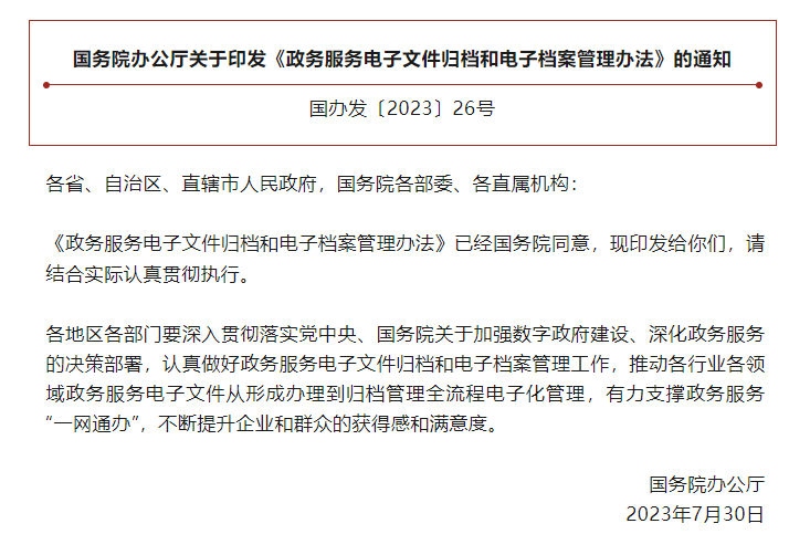 電子文件和電子檔案已成為政府治理、社會發(fā)展的重要記錄,是數(shù)字中國、數(shù)字政府建設(shè)的有力見證,是國家信息資源的重要組成部分。《辦法》的出臺為進(jìn)一步做好電子文件歸檔和電子檔案管理工作提供了遵循。