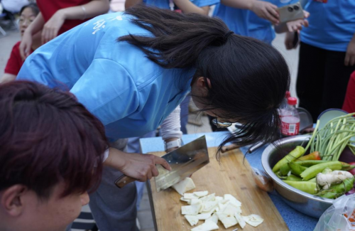圖為實踐隊員在黨校食堂自己切菜準備做飯