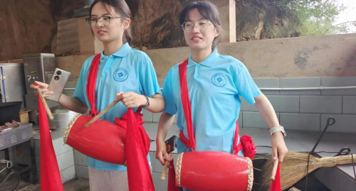 圖為實踐隊員在延安教育基地學習打腰鼓