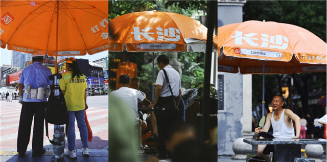 遮陽傘取之于生活,是尋常生活里的物件,但唯獨在高溫暴曬的自然天氣下成為了人們的剛需。是人們在情緒焦躁之時,最大的心理紓解之處。也因此,在長沙的大街上,這些遮陽傘尤為引人注目。