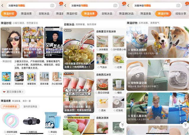 在話題發(fā)酵傳播的同時,在淘寶站內(nèi)也同步上線了相應的消暑活動,各類豐富的消暑產(chǎn)品一一供應,也又一次凸顯了淘寶貨品供應之豐富,可以滿足人們各式各樣的防暑需求。并且,線下和線上的轉化鏈條也十分順滑,在遮陽傘下會有相關清涼解決方案的露出,在淘寶搜索“消暑神器有哪些”就可以直接進入相關會場。從情緒點觸及到轉化非常自然。