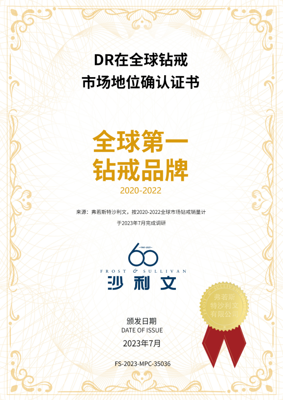 從2020到2022年,DR鉆戒已經(jīng)連續(xù)三年位居全球求婚鉆戒銷量第一。弗若斯特沙利文經(jīng)過全球數(shù)據(jù)調(diào)研,數(shù)據(jù)顯示,DR是“全球第一求婚鉆戒品牌”和“全球第一鉆戒品牌”。業(yè)內(nèi)人士分析稱,DR之所以能夠成為全球第一的求婚鉆戒品牌,主要是憑借其獨特品牌理念、產(chǎn)品硬實力、高坪效旗艦店以及3000萬的真愛粉絲。