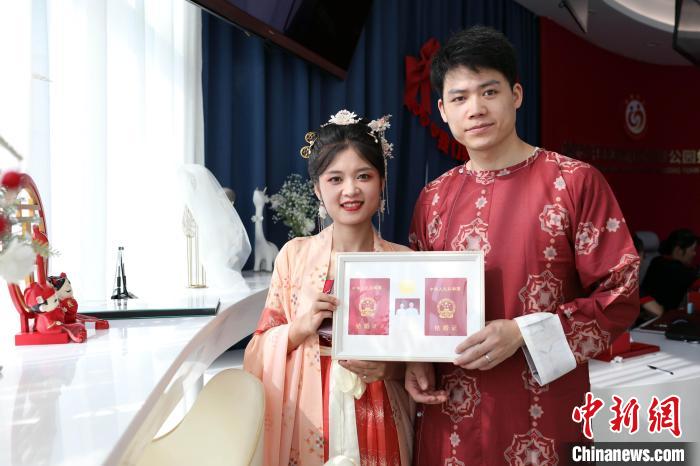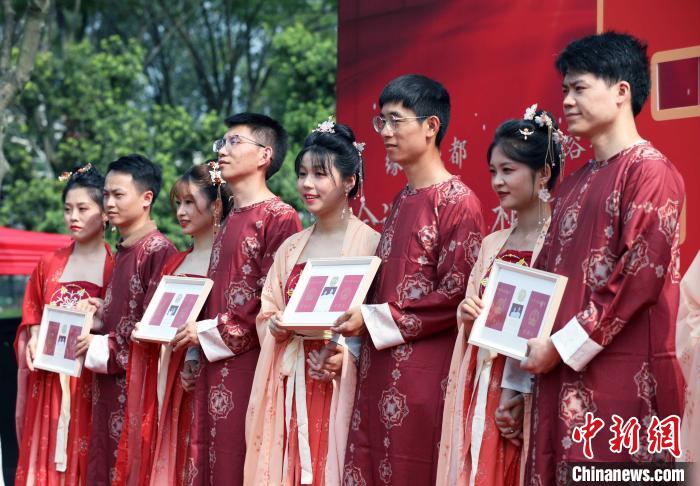 中新網(wǎng)成都8月22日電 (王利文)8月22日是七夕節(jié),新人白耀鵬和陳亞芬選擇結束了八年的“愛情長跑”,在成都市金牛區(qū)府河攝影公園婚姻登記處辦理結婚登記。當天,“金遇良緣·相約七夕”集體頒證儀式暨七夕漢服游園會在此舉行。