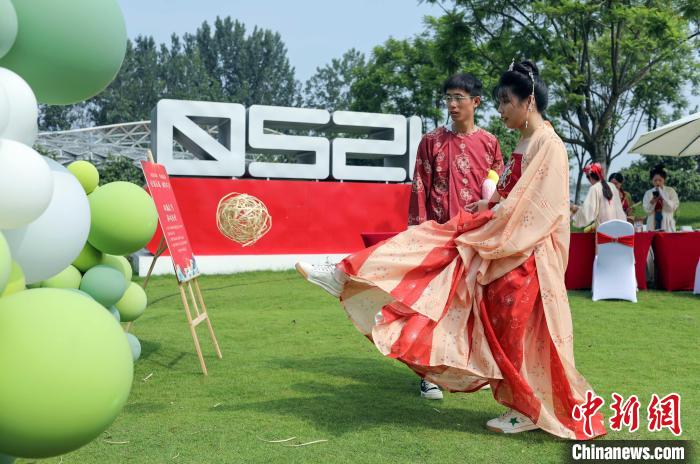 活動現(xiàn)場,6對新人身著傳統(tǒng)婚服,步履莊重地走上舞臺接受集體頒證。隨后,新人們手執(zhí)金剪,在彼此頭上剪下一縷青絲,并放于結發(fā)袋中,寓意“結發(fā)夫妻,白頭偕老”。儀式結束后,新人們紛紛參與到游園活動中,玩起穿針乞巧、投壺取巧等游戲。