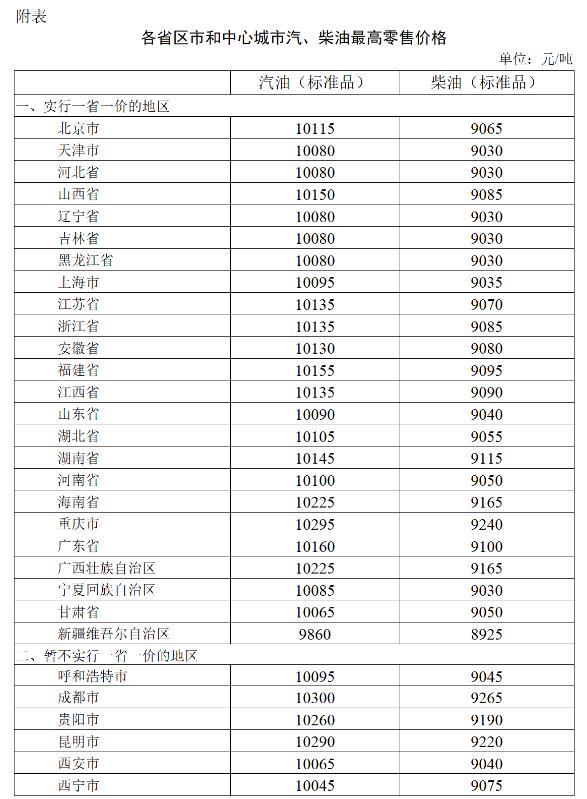 附:各省區(qū)市和中心城市汽、柴油最高零售價格