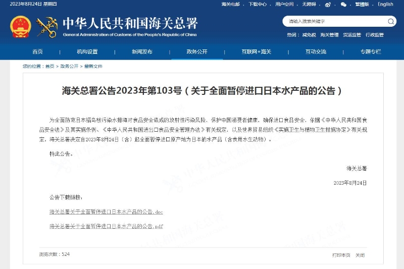 中新網(wǎng)8月24日電 據(jù)海關(guān)總署網(wǎng)站消息,為全面防范日本福島核污染水排海對食品安全造成的放射性污染風(fēng)險,保護(hù)中國消費者健康,確保進(jìn)口食品安全,依據(jù)《中華人民共和國食品安全法》及其實施條例、《中華人民共和國進(jìn)出口食品安全管理辦法》有關(guān)規(guī)定,以及世界貿(mào)易組織《實施衛(wèi)生與植物衛(wèi)生措施協(xié)定》有關(guān)規(guī)定,海關(guān)總署決定自2023年8月24日(含)起全面暫停進(jìn)口原產(chǎn)地為日本的水產(chǎn)品(含食用水生動物)。