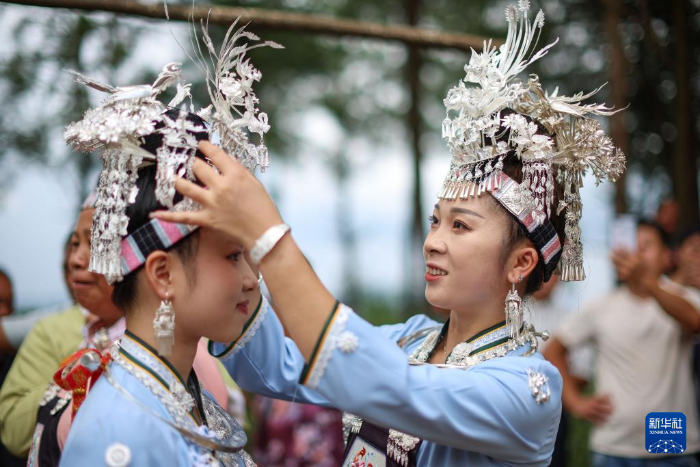 8月22日,苗族村民在“爬坡節(jié)”上整理頭飾。新華社發(fā)(楊勝賢 攝)
