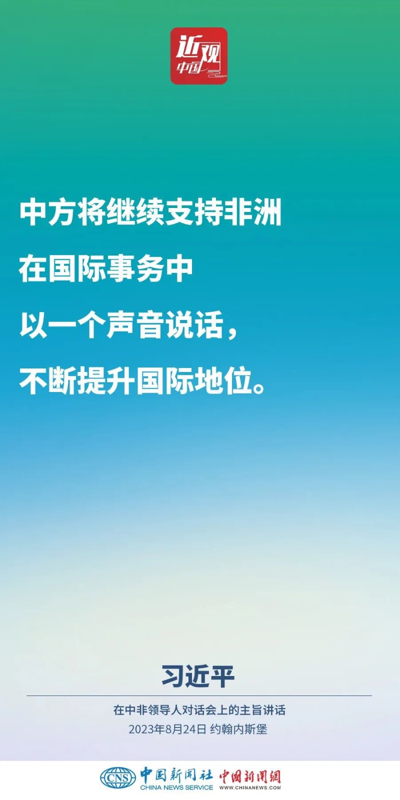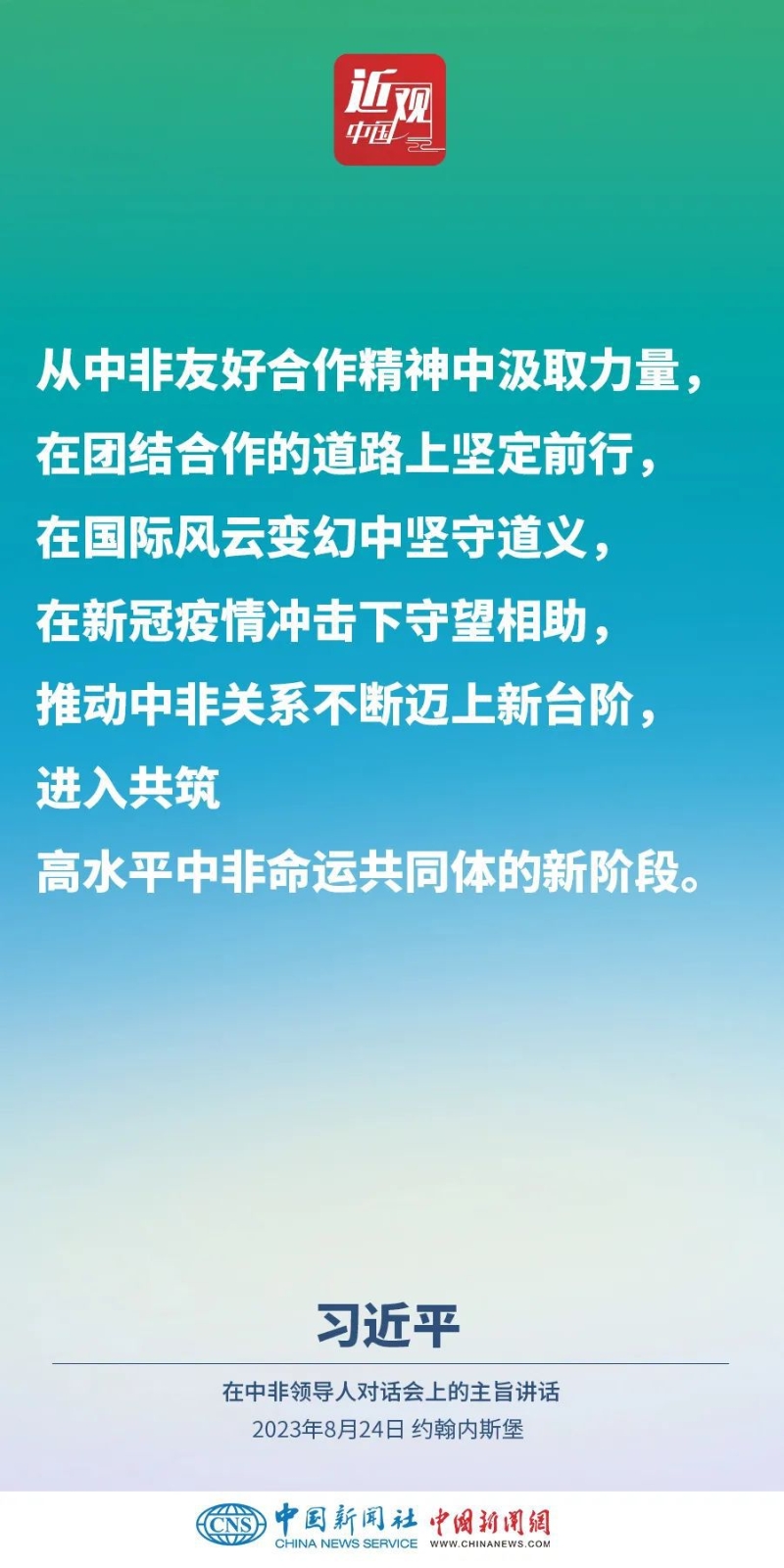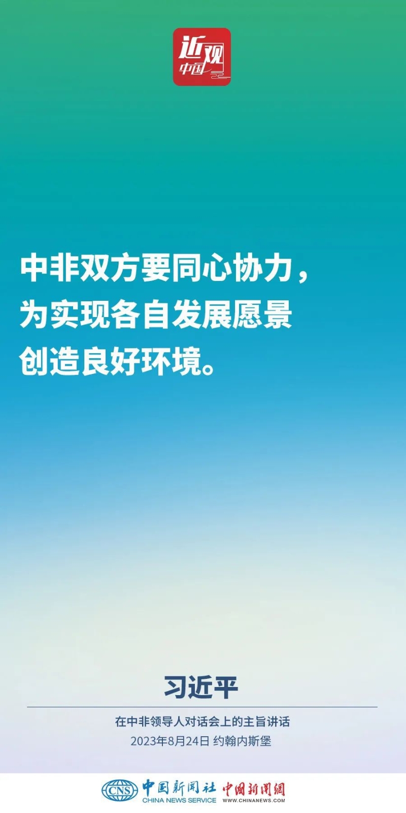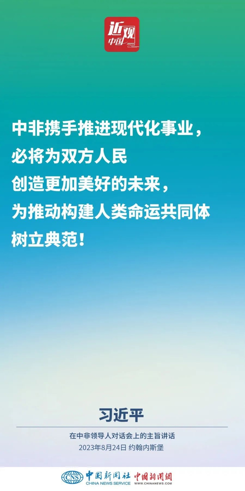 當(dāng)?shù)貢r(shí)間8月24日晚,國(guó)家主席習(xí)近平和南非總統(tǒng)拉馬福薩在約翰內(nèi)斯堡共同主持中非領(lǐng)導(dǎo)人對(duì)話會(huì)。習(xí)近平發(fā)表題為《攜手推進(jìn)現(xiàn)代化事業(yè) 共創(chuàng)中非美好未來(lái)》的主旨講話。講話指出,中國(guó)和非洲正在通過(guò)共同探索現(xiàn)代化的生動(dòng)實(shí)踐回答歷史之問(wèn),攜手推進(jìn)合作共贏、和合共生、文明共興的歷史偉業(yè)。
