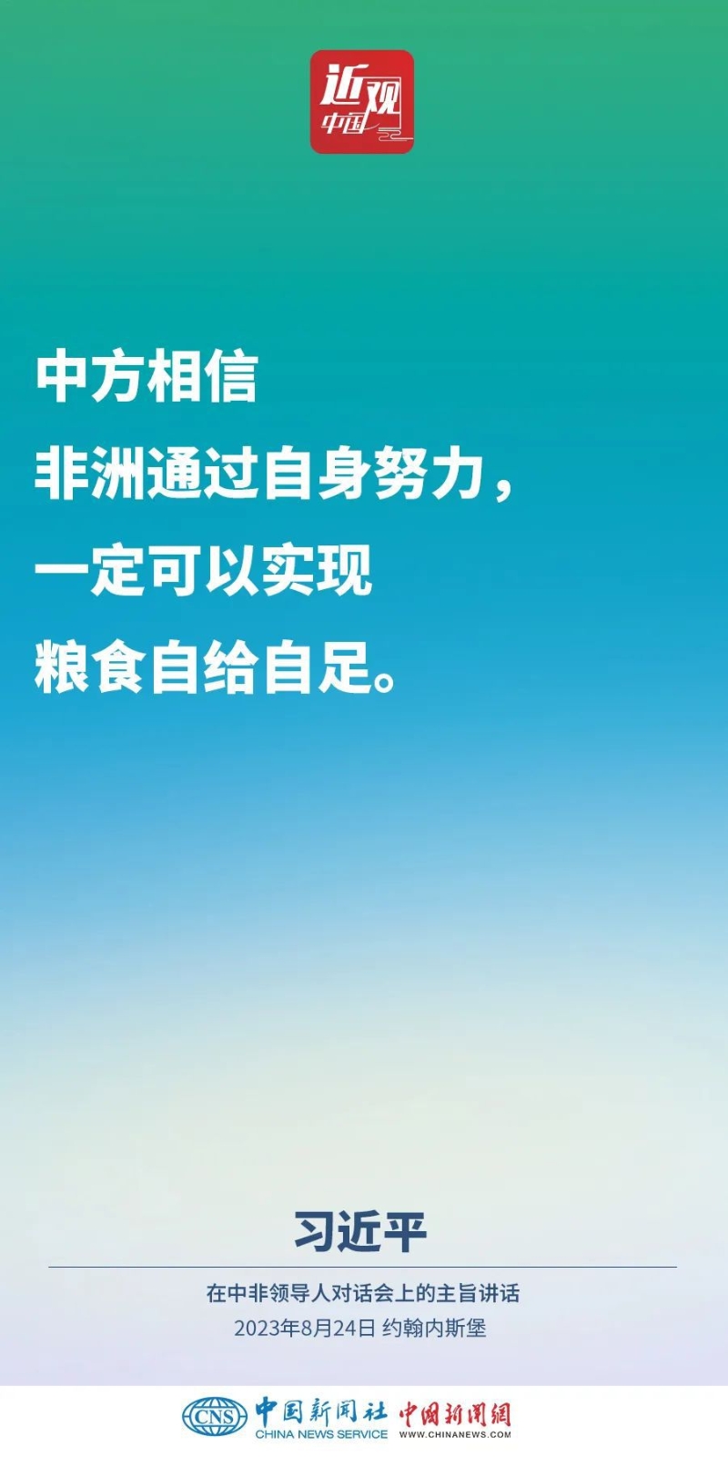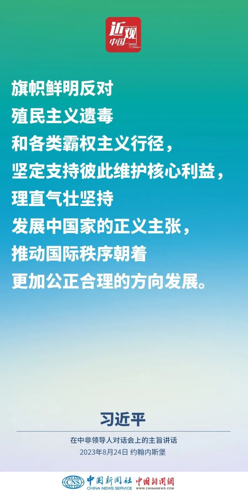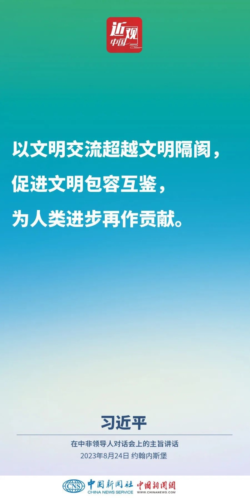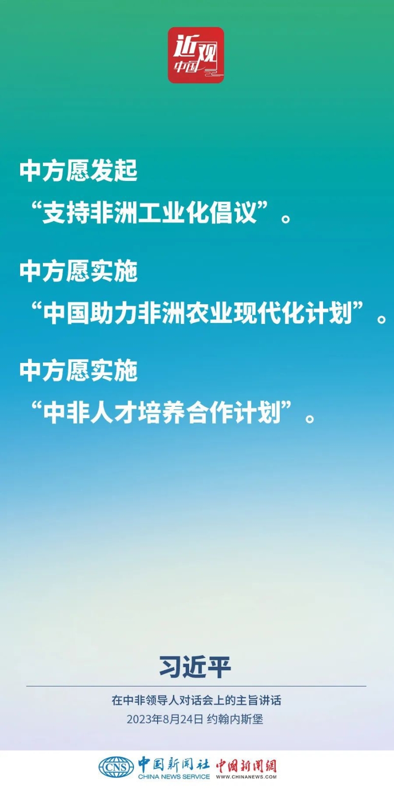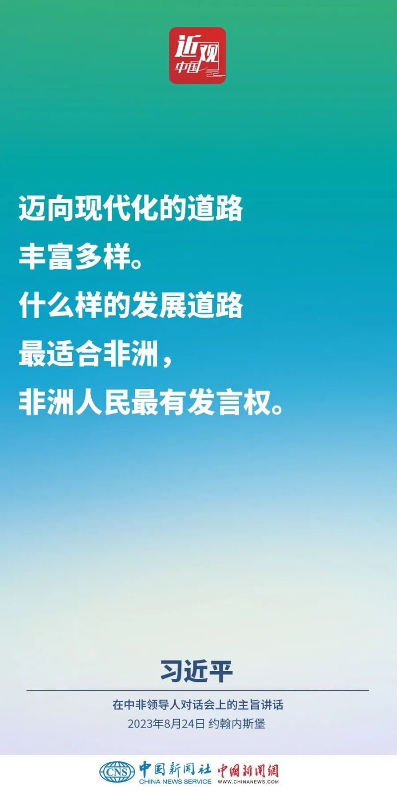 當(dāng)?shù)貢r(shí)間8月24日晚,國(guó)家主席習(xí)近平和南非總統(tǒng)拉馬福薩在約翰內(nèi)斯堡共同主持中非領(lǐng)導(dǎo)人對(duì)話會(huì)。習(xí)近平發(fā)表題為《攜手推進(jìn)現(xiàn)代化事業(yè) 共創(chuàng)中非美好未來(lái)》的主旨講話。講話指出,中國(guó)和非洲正在通過(guò)共同探索現(xiàn)代化的生動(dòng)實(shí)踐回答歷史之問(wèn),攜手推進(jìn)合作共贏、和合共生、文明共興的歷史偉業(yè)。