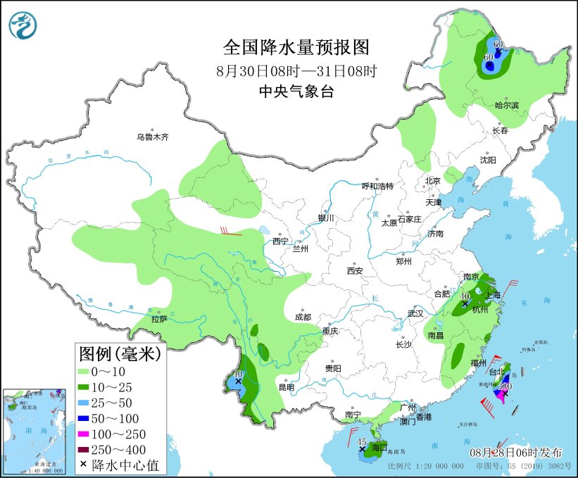 8月29日08時至30日08時,黑龍江南部和東部、吉林東北部、上海、浙江西部和北部、福建中部、廣東西南部、海南島大部、云南西南部和北部、臺灣島東部等地部分地區(qū)有大到暴雨,其中,黑龍江東南部等地局地有大暴雨(100~120毫米)。黑龍江東部、新疆東部、甘肅西部等地部分地區(qū)有4~5級風(fēng)(見圖3)。渤海、渤海海峽、黃海大部海域?qū)⒂?~8級、陣風(fēng)9級的大風(fēng),巴士海峽、臺灣以東洋面將有6~8級、陣風(fēng)9~10級的大風(fēng),其中臺灣以東洋面和巴士海峽風(fēng)力可達9~11級、陣風(fēng)12~13級,臺風(fēng)“蘇拉”中心經(jīng)過的附近海域風(fēng)力可達12~16級、陣風(fēng)17級及以上。