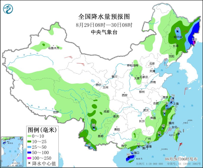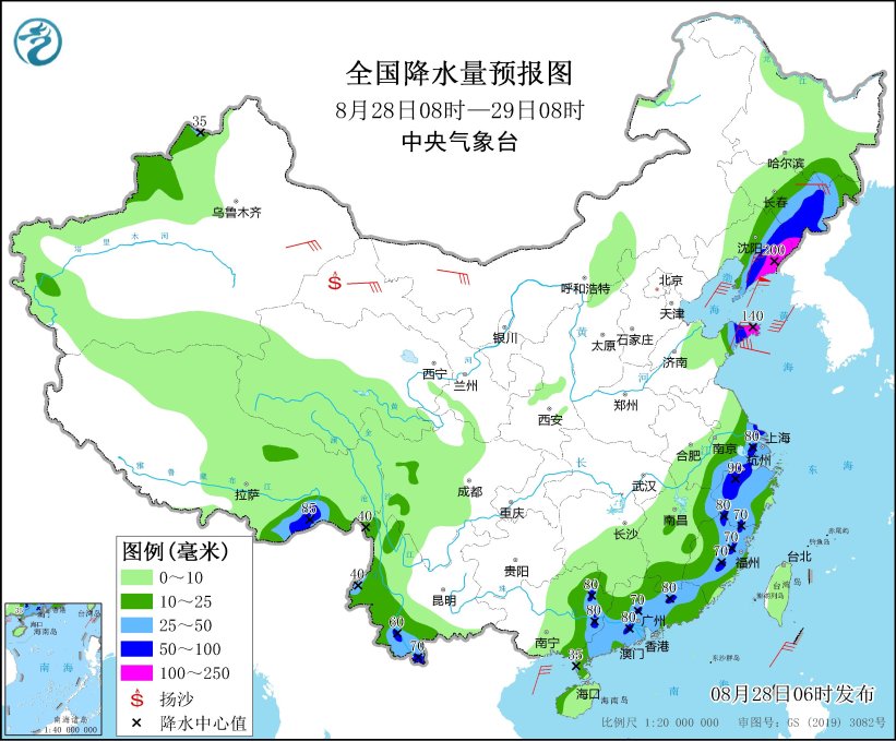 8月28日08時至29日08時,遼寧東部、吉林東部、山東半島東部、上海、浙江、福建中東部、廣東中南部、廣西東部、云南西南部、西藏東南部等地部分地區(qū)有大到暴雨,其中,遼寧東部、吉林東南部、山東半島東部等地局地有大暴雨(100~200毫米)。內(nèi)蒙古西北部、新疆東部、甘肅河西、吉林東部、遼東半島、山東半島等地部分地區(qū)有4~6級風(fēng)。甘肅西部等地部分地區(qū)有浮塵或揚沙(見圖2)。渤海、渤海海峽、黃海大部海域?qū)⒂?~8級、陣風(fēng)9級的大風(fēng),其中黃海北部和中部的部分海域風(fēng)力可達9級、陣風(fēng)10級。
