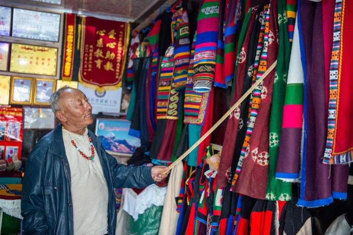 8月27日,努拉老人在向顧客介紹森郭服飾。(旦增努布 攝)