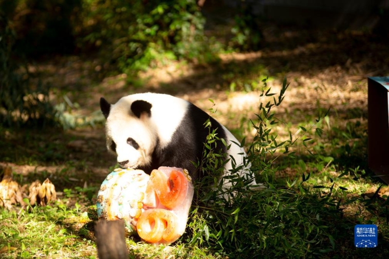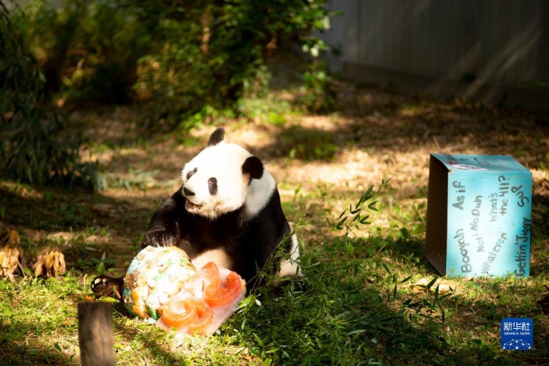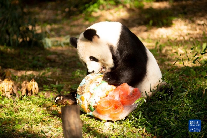 8月27日,大熊貓“添添”在美國(guó)首都華盛頓史密森學(xué)會(huì)國(guó)家動(dòng)物園享用生日蛋糕。
