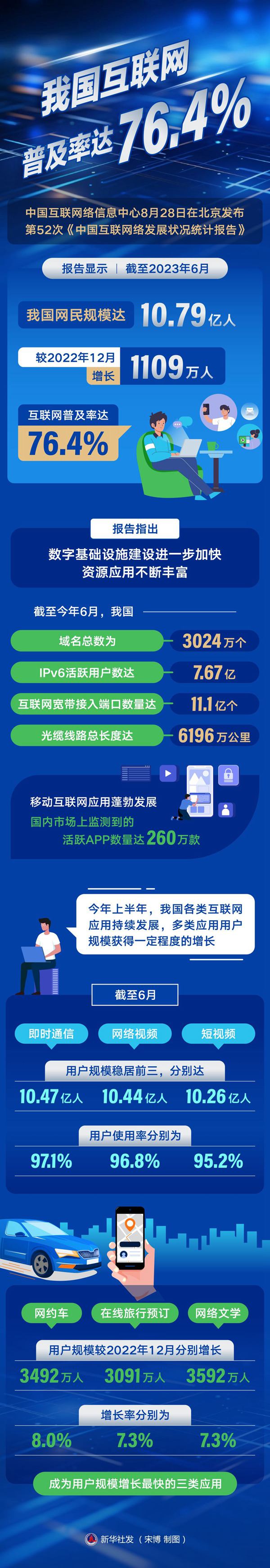 新華社北京8月28日電(記者王思北)中國互聯網絡信息中心28日在京發(fā)布第52次《中國互聯網絡發(fā)展狀況統(tǒng)計報告》。報告顯示,截至2023年6月,我國網民規(guī)模達10.79億人,較2022年12月增長1109萬人,互聯網普及率達76.4%。