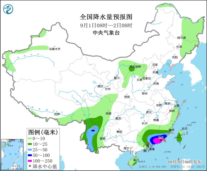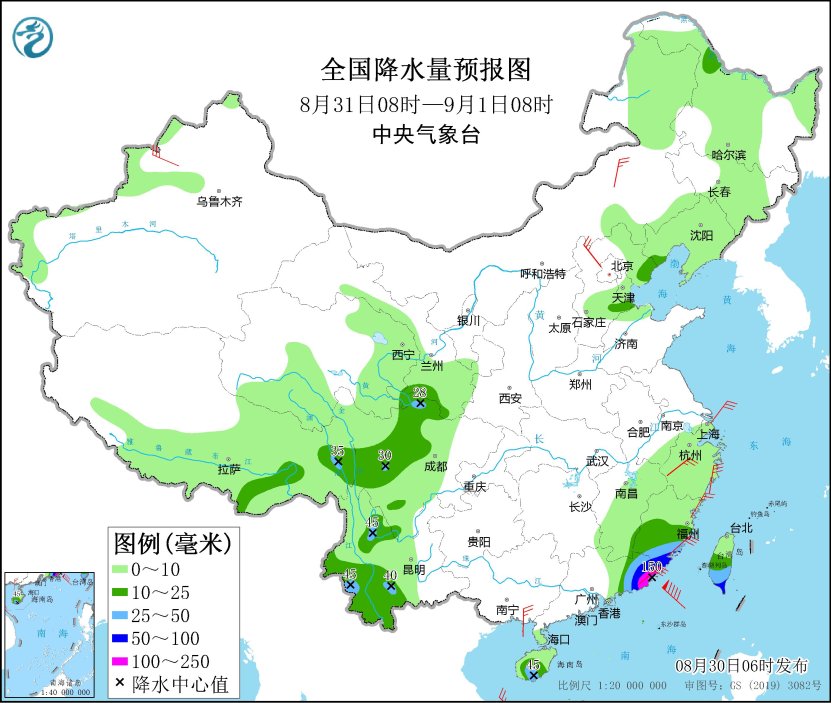 8月31日08時(shí)至9月1日08時(shí),河北東北部、甘肅南部、西藏東部、川西高原北部、四川西南部、云南中西部、福建中部和南部、廣東東部、海南島等地的部分地區(qū)有中到大雨,其中,福建南部、廣東東部、臺(tái)灣島南部等地的部分地區(qū)有暴雨,局地大暴雨(100~150毫米)。新疆西北部、內(nèi)蒙古中部、河北北部、浙江、福建東部和廣東東部沿海、廣西南部等地的部分地區(qū)有4~6級(jí)風(fēng),陣風(fēng)7~8級(jí)(見(jiàn)圖3)。