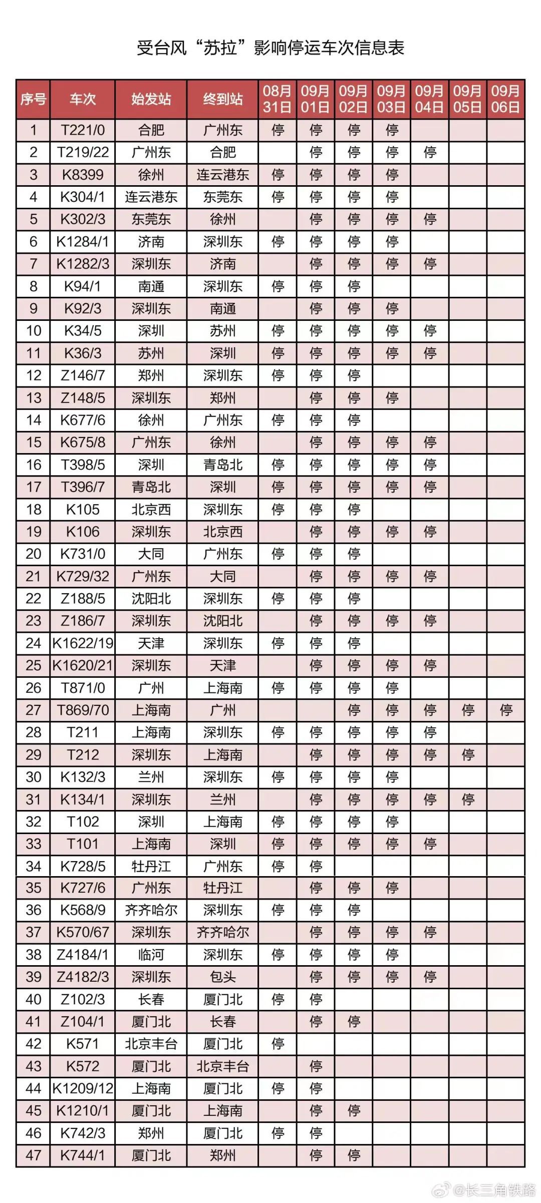 據(jù)中國鐵路上海局集團(tuán)公司消息,受第9號(hào)臺(tái)風(fēng)“蘇拉”影響,為確保列車運(yùn)行安全,鐵路部門計(jì)劃對杭深線、京港高鐵、廣深城際、廣深港高鐵、穗深城際、京九線等線路運(yùn)行的部分列車采取停運(yùn)措施。截至30日17時(shí)30分,計(jì)劃停運(yùn)8月31日至9月6日間共121趟旅客列車:其中停運(yùn)動(dòng)車組列車74趟,停運(yùn)普速列車47趟。