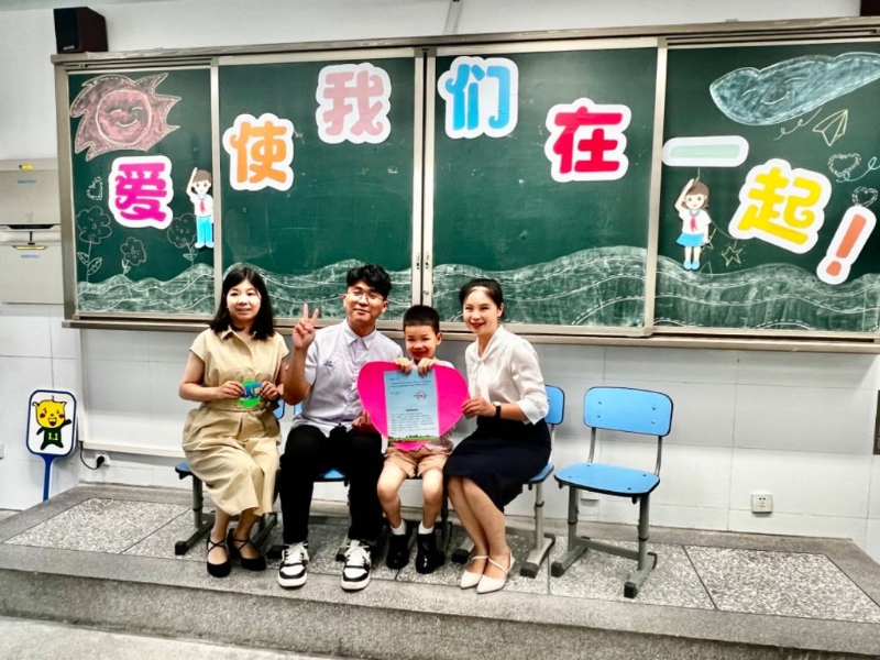 8月30日,成都市泡桐樹小學(xué)西區(qū)分校一年級(jí)一班的班主任、副班主任和新生及家長在教室內(nèi)拍照留念。新華社記者吳曉穎 攝