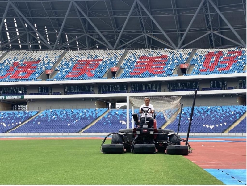 圖為工作人員在杭州亞運(yùn)會(huì)足球比賽場(chǎng)地之一溫州奧體中心體育場(chǎng)養(yǎng)護(hù)草坪。新華社記者魏一駿攝