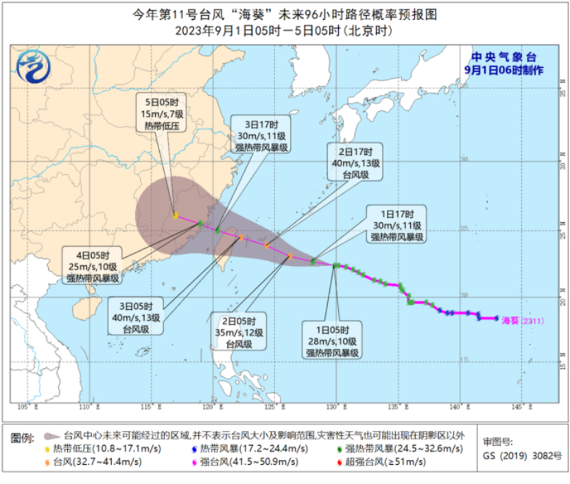 受其影響,9月1日夜間至3日,東海南部海域、臺灣以東洋面、臺灣海峽將有7~9級、陣風10~11級的大風,其中部分海域風力可達10~11級、陣風12~13級,臺風“??敝行慕?jīng)過的附近海域風力可達12~13級、陣風14~15。臺灣島中北部、福建、浙江東部、江蘇中部等地有大到暴雨,福建東部、浙江東部部分地區(qū)大暴雨。