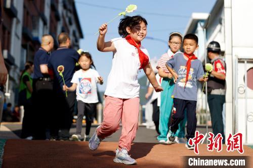 9月1日,北京275所受災(zāi)中小學(xué)和幼兒園如期開學(xué)。圖為門頭溝區(qū)王平村中心小學(xué)學(xué)生手拿“向日葵”入校。中新社記者 富田 攝