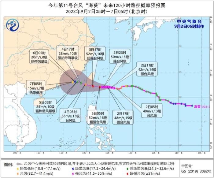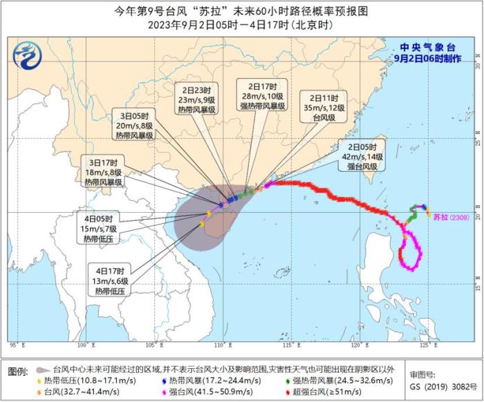 9月2日08時(shí)至3日08時(shí),受“蘇拉”影響,南海西北部、北部灣東部、瓊州海峽及廣東沿海、廣西南部沿海、珠江口以及香港和澳門等地將有7-9級(jí)、陣風(fēng)10-11級(jí)的大風(fēng),“蘇拉”中心經(jīng)過(guò)的附近海面或地區(qū)風(fēng)力有12-13級(jí)、陣風(fēng)14-15級(jí);受“海葵”影響,臺(tái)灣海峽、浙江南部沿海、福建沿海、廣東東部沿海、臺(tái)灣島沿海將有6-7級(jí),陣風(fēng)8級(jí)大風(fēng),臺(tái)灣以東洋面部分海域風(fēng)力可達(dá)8-10級(jí),陣風(fēng)11-12級(jí),“??敝行慕?jīng)過(guò)的附近海面風(fēng)力可達(dá)12-13級(jí),陣風(fēng)14級(jí)。