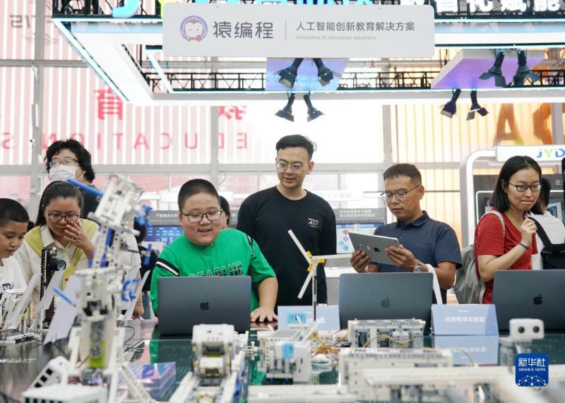 9月3日,在首鋼園教育服務(wù)專題展區(qū),小朋友在體驗(yàn)智能硬件編程作品。