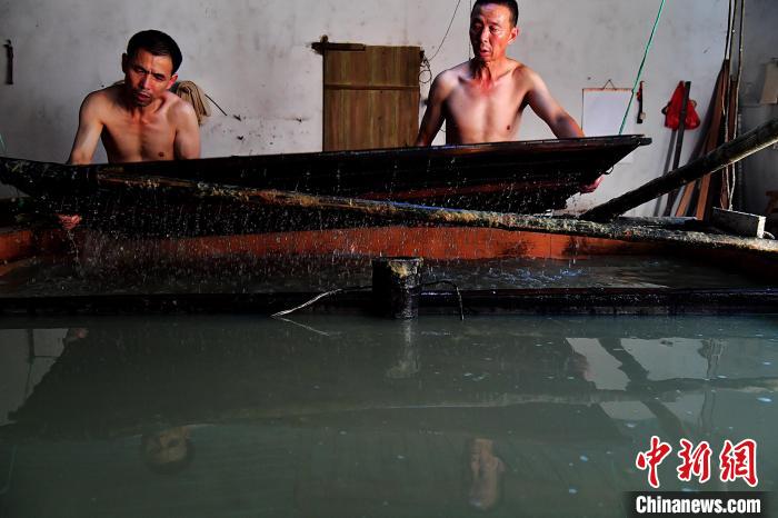 抄紙是最考驗(yàn)手藝人技術(shù)的環(huán)節(jié),手藝人要做到心手相連,雙手將紙簾放入漿液中,慢慢抄起漿液,前后左右蕩,利用手腕的力量過(guò)濾掉多余的雜質(zhì),將精華留住,反扣在紙架上,一張紙就好了。