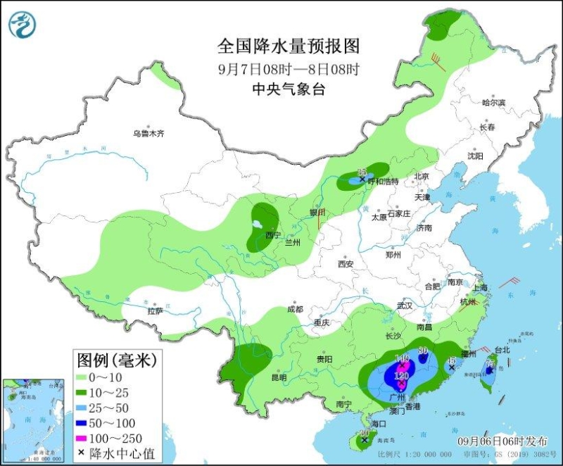 9月7日08時(shí)至8日08時(shí),青海東部、內(nèi)蒙古河套地區(qū)、福建中南部、廣東大部、江西中南部、湖南南部、海南島大部、臺(tái)灣島等地部分地區(qū)有中到大雨,其中,廣東中部、江西南部、湖南東南部、臺(tái)灣島中部等地部分地區(qū)有暴雨到大暴雨(100~140毫米)。寧夏中部、浙江中部等地部分地區(qū)有4~6級(jí)風(fēng),內(nèi)蒙古東北部部分地區(qū)有6~7級(jí)風(fēng)(見圖3)。